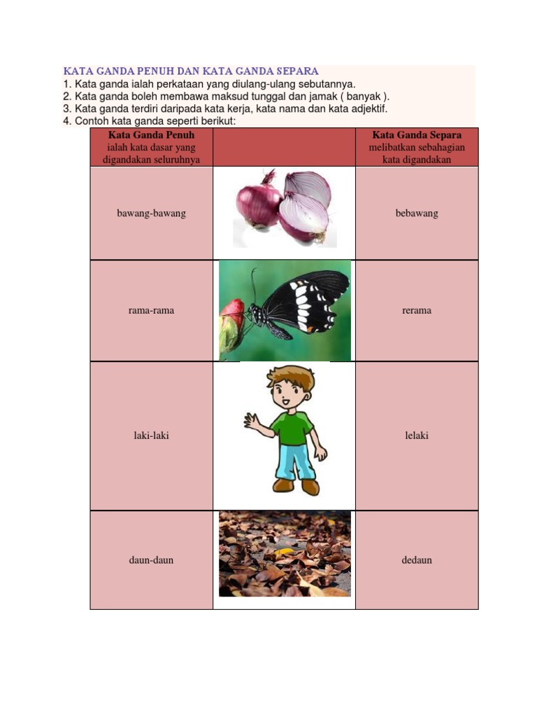 Kata ganda separa terbentuk apabila sebahagian daripada kata sahaja yang digandakan. Kata dasar terdiri daripada kata tunggal atau kata berimbuhan. Terdapat 4 bentuk kata ganda iaitu : Kata ganda ialah kata yang terbentuk daripada kata yang digandakan, sama ada sebahagian atau seluruhnya. Kuiz latihan kata ganda separa. Kata ganda bersajak atau berima. Beberapa ekor _ berterbangan di tepi tasik yang jernih itu. 3.bebuluh itu dibelah un tuk dibuat lantai rumah. Menurut asraf (2012), kata ganda separa ialah kata ganda yang mengalami pengulangan suku kata pertama pada kata asalnya. Pengertian kata ganda separa dan contoh kalimatnya. Kata ganda online worksheet for tahap 2. Contoh penggunan kata ganda separa dalam ayat: Kata ganda ialah kata yang terbentuk daripada kata yang digandakan sama ada sebahagian atau seluruhnya.