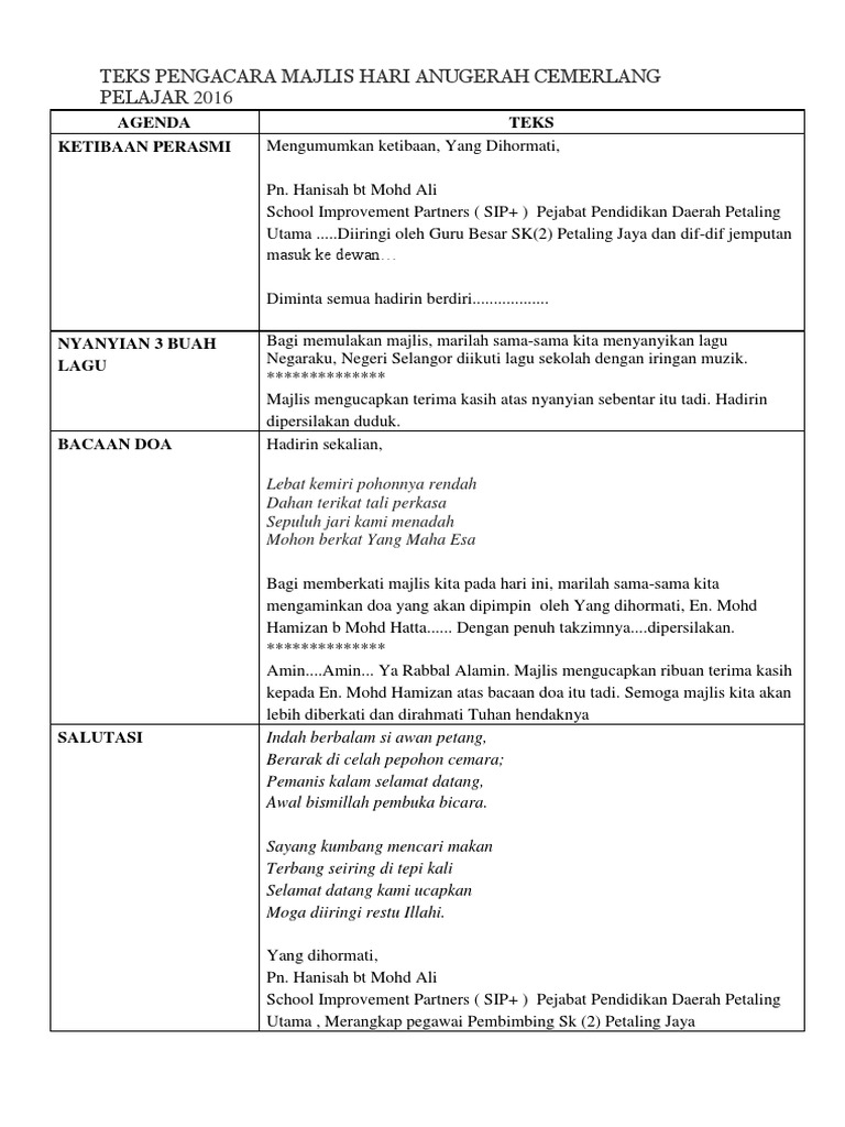 Bagi memastikan majlis berjalan dengan lancar, hadirin diingatkan agar mematikan atau memastikan telefon bimbit berada dalam pengaturcaraan senyap. Datuk jame alip pengarah pendidikan negeri sabah 3. Sawah menghijau di tengah bendang, tumbuh dipinggir pohon bidara, pemanis kata bagi memberkati majlis kita ini, marilah kita mengaminkan bacaan doa yang akan dipimpin oleh alfadhil ustaz tahniah. Majlis anugerah perkhidmatan cemerlang tahun 2019 tarikh : Menyedari masalah ini, sgo dengan murah hati berkongsi teks pengerusi majlis. Teks pengacara hari anugerah cemerlang akademik. Majlis anugerah perkhidmatan cemerlang (apc) tahun 2011 institut penyelidikan hidraulik kebangsaan malaysia (nahrim). Contoh teks pengacara majlis / ucapan emcee majlis persaraan cikgu. Teks pengacara majlis majlis sambutan maulidurras. Teks majlis anugerah perkhidmatan cemerlang 2014 aluan pengacara majlis assalamualaikum wrth, salam. Majlis anugerah perkhidmatan cemerlang 2017. Teks pengacara program / bengkel. Disini admin nak kongsikan bahan tersebut.