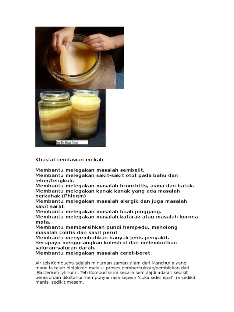 Tapi ada juga yang tak boleh masuk tekak kan. Selain itu ia dapat menurunkan tekanan darah tinggi, menambahkan tenaga termasuk tenaga seksual. Kali pertama wani tengok kulat mekah ni sebab ada rakan facebook asyik post pasal kulat mekah ni, wani asyik tengok gambar sebab jakun kenapa boleh panggil kulat, padahal terendam dalam air. Sistem penghadaman yang lebih baik. Khasiat cendawan mekah membantu melegakan masalah sembelit. Menurut kajian, cendawan mekah mengandungi probiotik atau bakteria baik yang sama macam dalam minuman yogurt dan yogurt. Khasiat cendawan mekah atau kombucha air teh kombucha adalah minuman zaman silam dari manchuria yang mana ia telah dibiakkan melalui proses pembentukkan/pembiakan dari 'bacterium lylinum'. Untuk membancuh air cendawan mekah,anda hanya perlu campurkan sedikit pati cendawan mekah ke dalam segelas air masak ,tambahkan gula secukupnya, kacau dan kemudian ia boleh terus dihidangkan. Allah menurunkan penyakit beserta penawarnya sekali. Membantu melegakan masalah bronchitis, asma dan batuk. 1,215 likes · 3 talking about this. Teh kombucha ini secara semulajadi adalah sedikit berasid dan diketahui mempunyai rasa seperti 'cuka sider epal', ia sedikit manis. Cendawan ni hidup dengan menjadikan gula sebagai makanannya dan dari hasil uraian gula tersebut terhasillah penawar yang sangat ampuh menangani masalah usus dan memerangi kanser secara amnya.